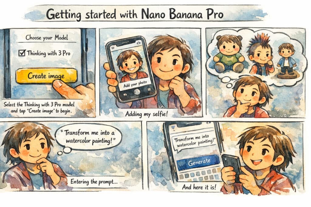 “Create a comic with the title: Getting started with Nano Banana Pro. Panel 1: A mobile interface on Gemini, rendered in a poetic watercolor-ink style with fine ink outlines and soft, bleeding washes. The interface is friendly and a hand painted with expressive brushwork taps a prominent button labeled “Create image”. Above the button it should say “Choose your Model” then below there should be a checkbox that says “Thinking with 3 Pro” Muted greys and blues dominate the background. The button has a vivid yellow accent. “ Select the Thinking with 3 Pro model” and tap “Create image” to begin. Panel 2: A cheerful person is depicted adding their selfie from the phone’s camera. The user’s face is drawn with soft outlines and warm pastel colors, while the phone and UI maintain the delicate water-ink aesthetic. Visible paper grain adds to the texture. Panel 3: The person thinks about what to create. In the background, different options are visualized to show what they’re thinking, including — them as a plushie, them with a mohawk hairstyle, and a figurine. These options are clearly rendered behind the person in the same style as the rest of the comic. Panel 4: The person is shown adding a style prompt, with a speech bubble saying “Transform me into a watercolor painting”. The text is integrated into the panel’s watercolor-ink look, and the interaction feels natural and intuitive. Panel 5: The person is seen editing the image by simply typing into Gemini. The scene captures the ease of this interaction, with the final edited image, now in a watercolor style, appearing on the screen. The overall tone is friendly, instructional, and inspiring. It feels like a mini tutorial comic, all conveyed through the specified delicate water-ink illustration style. Make the aspect ratio 16:9.”
